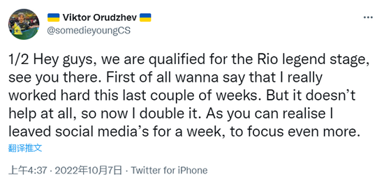 第一条推特是关于工作的:“大家好,我们目前已经成功晋级里约Major传奇组,里约见。首先我想说的是过去几周里我真的有在非常刻苦的训练,但事实上这完全于事无补。所以现在我决定加倍训练。正如你们所看见的,我先前很长时间都没玩推特了,只为了能更专心于比赛。”
