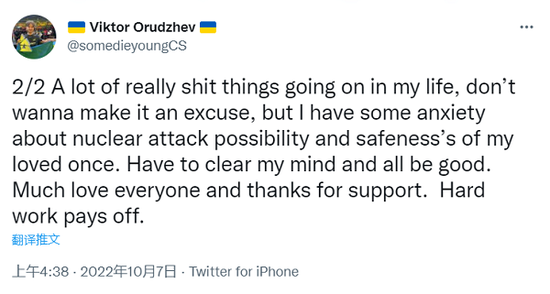 第二条推特是关于生活的:“我的生活里也有很多烦心事。这并不是要为比赛发挥找借口,但我确实很担心核打击的可能性,担心所爱之人的安全。我需要清空大脑,相信一切都会好的。爱你们每个人,感谢大家的支持。付出必定有回报。”