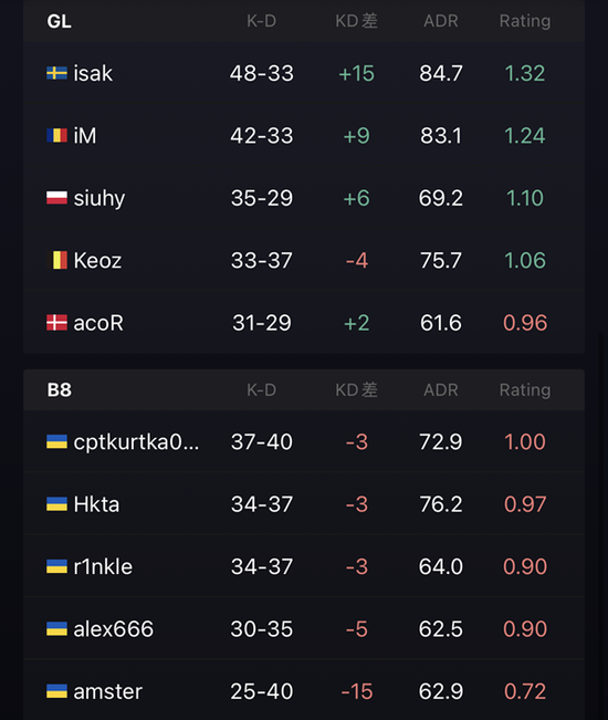 另一场2-2的对决双方是GamerLegion和B8,昨日战胜G2的GL今天依旧保持良好的状态,isak、iM、siuhy发挥良好。图一Overpass上,他们在进攻方拿到6分的及格分数,随后在CT方严防死守成功打崩对手经济,最终16-12拿下图一。图二是B8的选图Nuke,丢掉手枪局后GL稳稳拿下第一个长枪局的胜利,守外场的isak状态爆炸,连续得分的GamerLegion甚至不需要acoR起狙,上半场接的结束阶段B8利用GL的松懈追回几分,可是到了下半场,乌克兰人们发现自己无法抵挡国际纵队的进攻,手感被打凉了的他们节节败退,最终10-16输掉图二,也离开了RMR舞台。