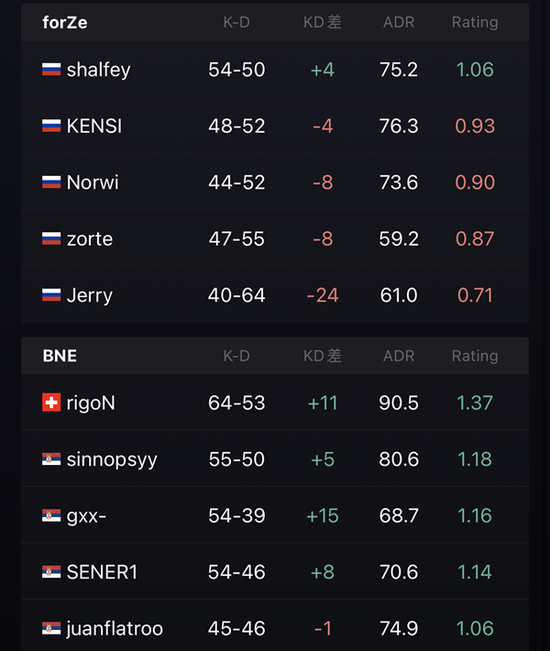 来到决胜图Mirage,拼刀之后BNE先防守。拿下手枪局的BNE延续了自己火热的防守手感。尤其是rigoN,来到Mirage他仿佛回到了自己家,主B的他回防怎么打怎么有,对面打B他也能顶住压力刷屏,这次是BNE半场取得11-4的领先。来到下半场,拿下手枪局的BNE士气高涨,forZe开始抵挡不住BNE的硬来套路,手感被打没的俄罗斯人最终4-16输掉了决胜图。