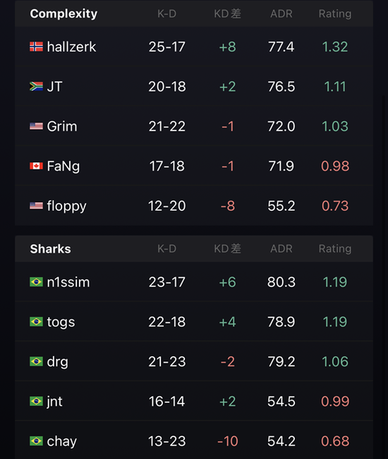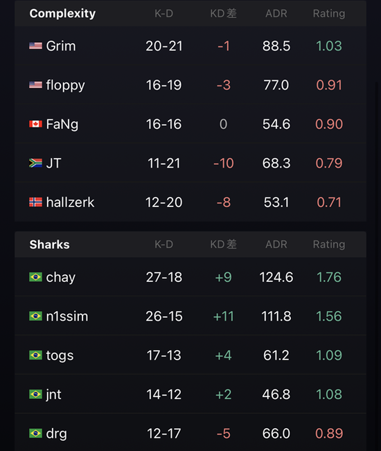 系列赛第一局来到了巴西大白鲨选择的Dust2,SHARKS在本图上选择了担任进攻方。手枪局Complexity选择中路强压放出A包点让Sharks下包,最后hallzerk连斩杀两人完成了对A包点的回放。延续着手枪局的火热手感coL再拿一分,但在第三局Sharks的Eco局上,白鲨快提A小打了coL一个猝不及防,虽然最后回防成功,但也被打掉四人,并且成功让鲨鱼下了雷包,这里Grim也展示了教科书般的AK点射。随后双方打的有来有回,互不相让。在第十四局的2v2残局中,chay灵性绕A大连杀两人,完成优秀残局,同时也将coL上半场最后的手感也削减,最后上半场定格在6-9,Sharks略胜一筹。