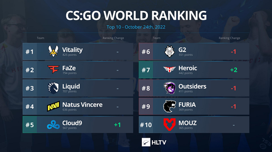 TOP10战队变化不是很大,Heroic因为在BLAST Showdown欧洲区夺冠上升2位,来到第7名。Cloud9积分超越G2,重回TOP5。G2、Outsidrs、FURIA各跌1名。
