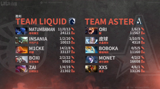 Liquid在天辉,Aster在夜魇。选人分路:上路是zai的拉席克和Boxi的海民对阵Monet的火枪和皮球的全能。中路是m1CKe的蓝猫对阵Ori的屠夫。下路是MATUMBAMAN的水人和iNsania的冰女对阵Xxs的玛西和Boboka的双头龙。