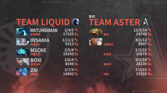 第一局双方前中期一直有来有回,场面十分激烈,35分钟双方一波买活大战,Aster交出四个买活控下肉山,但是Liquid耐心等到盾消的一瞬间直接五人开雾抓死Aster不能买活的双核,最后直接一波拆掉基地赢下了胜利。