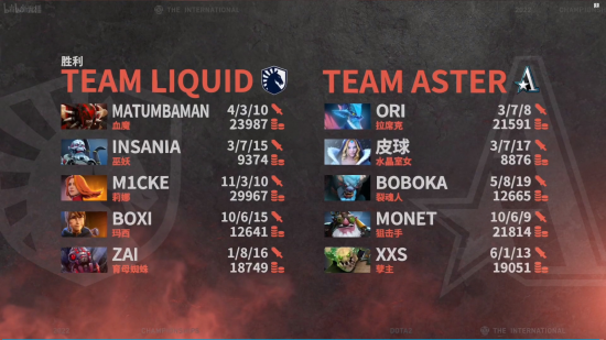 32分钟Aster打掉肉山,火枪带盾,36分钟Liquid来推最后一路的中路高地,Liquid只能发起死亡冲锋,但是拉席克冰女蓝猫陆续阵亡,蓝猫交出买活和队友最后一搏但是无济于事,众人阵亡之后打出GG。