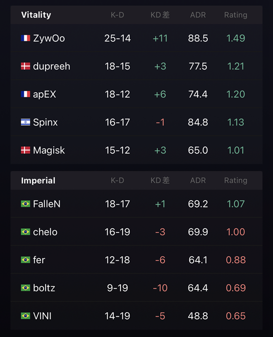 下半场攻防转换,以色列枪男和载物双人四杀直接攻破Imperial的A包点,小蜜蜂众人虽然延续了上半场的火热手感,但巴西教父和VINI多次拯Imperial于水火之中。Imperial用数次紧凑的防守锁死小蜜蜂。终于凭借阿杜的混烟突破和载物死点大狙的三杀,小蜜蜂艰难拿下赛点。赛点局豆豆一马当先先拿下连接,随后魔男和阿杜化身陀螺用枪法直接撕碎A包的防守,Vitality 16-9 Imperial!