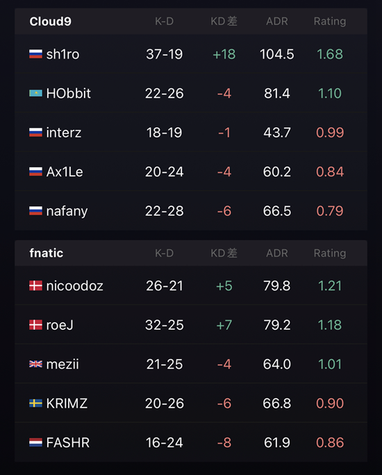 双方在炼狱小镇上展开对决,上半场C9先做进攻方,nicodoz的四杀直接打蒙C9,紧接着Fnatic密不透风的防守让C9吃尽了苦头。Fnatic甚至直接eco摆出usp枪阵,纯e翻盘C9。势不可挡的Fnatic连下数城,C9在霍师傅和sh1ro带领下艰难反击,上半场结束比分来到10-5。