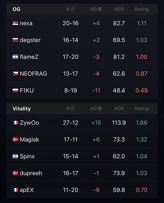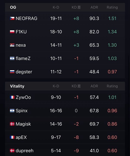 易边再战,小蜜蜂集合一波攻打B区,双方进行人数互换,最后nexa完成1v2残局,帮助OG拿下手枪局,下一局anti-eco,NEOFRAG甚至还刀了ZywOo。第十八局,degster的狙击枪出现失误直接被击杀,小蜜蜂一波进B区拿下这一分。之后OG没有给小蜜蜂更多机会,在香蕉道的强势和对中路近点的控制使他们的防守十分稳固,最终以16-6赢下图二。