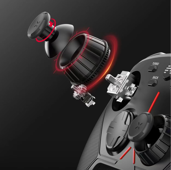 高精度双摇杆,7档灵敏度实时调节,游戏过程中完成物理变速;三段式霍尔扳机,三种线程任意切换,0.1mm按压精度,实现微操控。