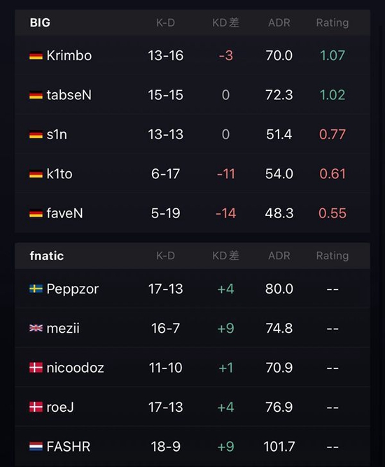 易边再战,fnatic在中路率先发难,mazii在中路秒杀对手前顶两人,Peppzor补枪带走第三人,顺势拿下手枪局和anti-eco局,比分来到13-4。第十八局,双方在A小一换一,随后BIG四人回防到位,虽然tabseN灵性混烟击杀下包进攻方,但后续BIG并没有补上伤害,攻防转换后躲在沙袋的mezii赢下残局,拿下关键第十四分和下一局BIGeco局,拿到赛点。第二十局,双方在A坡互换人数,fnatic进入到2v3残局,mezii凭一己之力击杀从后路回防的两名CT,随后又pick秒杀包点CT,一人残局三杀,帮助fnatic以16-4轻松赢下BIG选图图一。