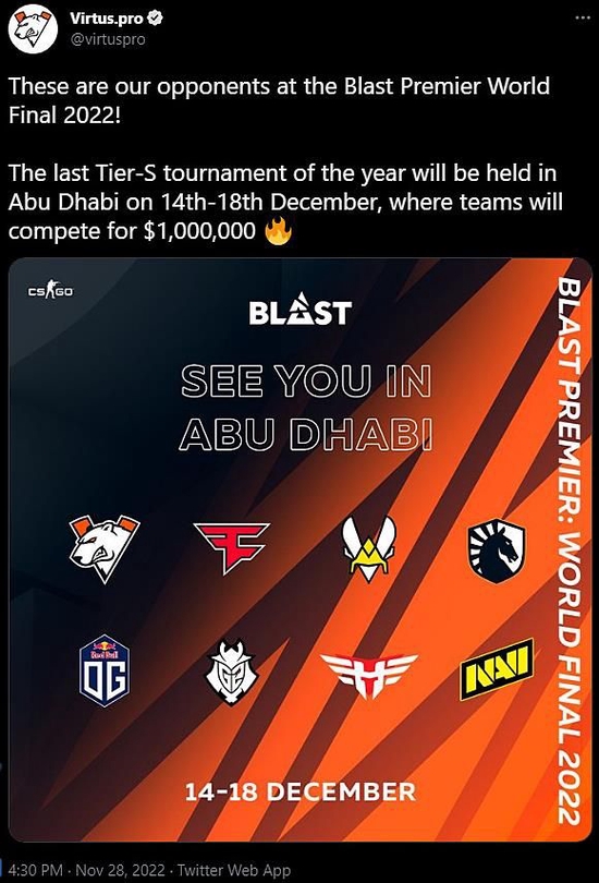 昨日有网友发现,VP官推发布了一条参加BLAST全球总决赛的公告,其海报上用的是VP战队的LOGO。虽然之后立马被删除了,但还是被保存了下来。这引起了广大网友的猜测,他们认为BLAST可能让VP用回本名参加比赛。