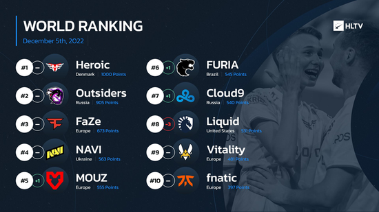 HLTV公布了本周最新的世界排名,Liquid下滑至第8,MOUZ、FURIA、C9皆上升一位。