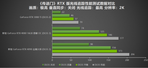 首先测试的是在2K分辨率下,DLSS技术开启和关闭的前后游戏帧数对比。通过测试数据可以直接看出,只有基于全新Ada架构打造的两张RTX 40系显卡,才能够做到在没有开启DLSS的情况下,以70fps以上的帧率流畅运行。而搭载第二代NVIDIA Ampere 的GeForce RTX 3080 Ti 显卡即便是在2K分辨率下,开启最高光线追踪技术后,游戏帧率仅仅能达到22fps左右的帧率运行。由此见得,《传送门》RTX版中的全景光线追踪对于GPU的性能需求其实是非常强的了。GeForce RTX 3080 Ti 虽然不支持DLSS 3技术,但还是能够通过DLSS 2技术进行帧数优化的。而在DLSS 性能模式下GeForce RTX 3080 Ti 帧数上涨了69%,直线飙到70fps达到流畅运行的标准。而支持DLSS 3技术的影驰 GeForce RTX 4090 金属大师和影驰 GeForce RTX 4080 16GB 星曜 OC就更不用说了,分别上涨到了206fps 和177fps。