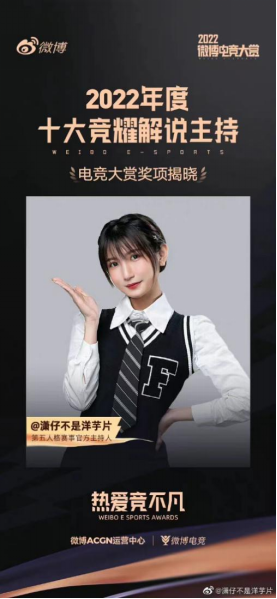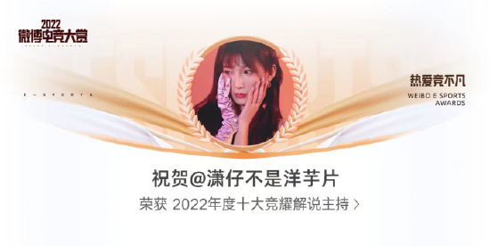 让我们恭喜潇潇获得2022年度十大竞耀解说主持,期待来年潇潇能给支持她的粉丝们带来更多的惊喜!