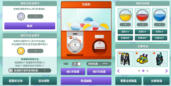 在幸运扭蛋机进行抽取可以获得各种颜色扭蛋。根据扭蛋颜色能够获得的道具种类不同。获得扭蛋后在活动页面打开扭蛋获得道具奖励。