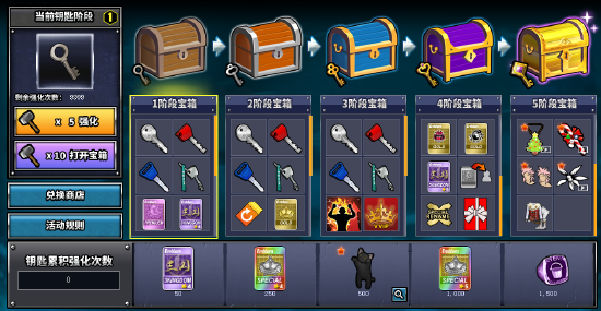 可以用传说的锤子[强化]钥匙并且可以打开对应阶段的宝箱。[强化]钥匙和打开宝箱所需的传说的锤子数量根据当前钥匙阶段来决定。钥匙分为1~5阶段,5阶段是最高阶段!强化钥匙时分为成功和失败。强化成功时钥匙阶段会上升,并且可以打开与钥匙阶段相对应的宝箱。打开对应宝箱后根据概率获得宝箱内道具。