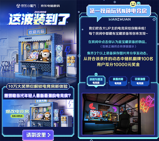 为了满足消费者对于“电竞房”改造需求,2022年12月23日-1月23日,京东联合B站共同发起了“改造电竞房”挑战活动,参与可刮分10万大奖。值得一提的是,京东还发布“爆改电竞房攻略”,海量热门电竞房单品至高享24期免息、更有爆款直降千元福利。