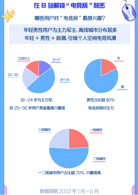 如今,电竞热潮影响力在进一步蔓延,年轻世代生活、空间、设备掀起“电竞风潮”,“电竞房”、“电竞酒店”、“电竞比赛”、“电竞动漫”等相关话题持续快速增长。其中,“电竞房”表现尤其亮眼,2022年1月-11月相关稿件播放量超4000万,同比增长5倍。