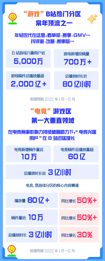 近年来,我国电竞行业发展速度迅猛。《报告》显示,2022年上半年,中国电子竞技用户规模已达到4.87亿人。数据显示,2022年1月-11月,B站游戏兴趣用户近5000万,在电竞赛事影响力持续破圈助力下,“电竞兴趣用户”在B站迅猛增长,电竞新增稿件量近10万,电竞稿件总播放量超60亿,总播放时长近3亿小时。