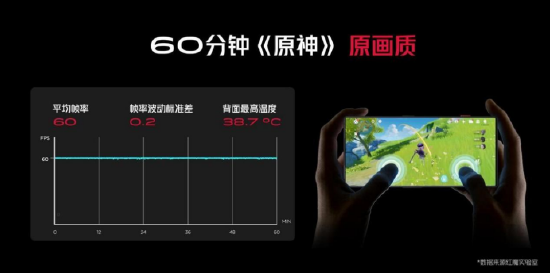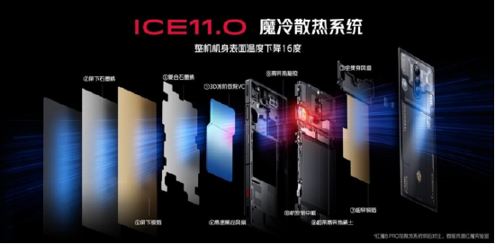 为了让红魔8 Pro系列在如此狂暴的性能输出下还能保持合适的手感温度,其散热系统进化到ICE11.0魔冷散热。首创3D冰阶双泵VC,体积达到行业顶尖的2068mm³;还拥有面积最大的全贯穿式风道,内置鲨鱼鳍离心风扇,空气流量提升35%;行业首创面屏下石墨烯,屏幕均热能力提升6倍。一共10层散热结构让机身温度下降16℃以上。实测原神运行60分钟,机身最高温度仅38.7°!
