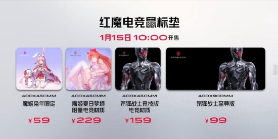 红魔三模电竞鼠标,搭载业界最高水准的原相3395传感器,GM8.0黑曼巴微动,在响应速度和点按手感上都属顶级梯队,首发价仅399元!此外还有四款电竞鼠标垫,魔姬兔年限定版仅需59元、魔姬夏日梦境版仅需229元、氘锋战士纪念版仅需159元,400*900*4大尺寸的红魔电竞桌垫氘锋战士至尊版仅需99元。以上产品均将于1月份同期上市!