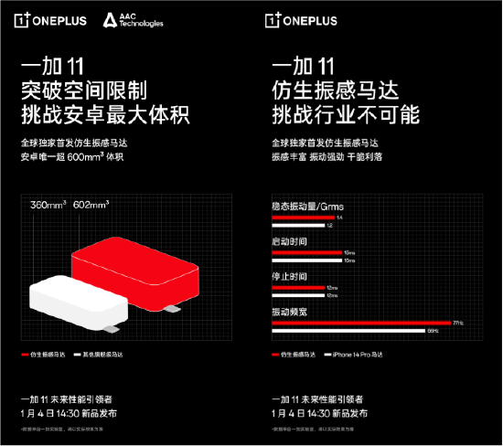 早在2019年,一加便与瑞声科技联合为一加 7 Pro定制当时安卓手机里尺寸最大、性能最强、响应最快的横向线性马达,刷新用户对安卓马达的认知。此后一加历代性能旗舰均搭载行业领先马达。顶级马达体验已融入一加的性能基因,此次独家搭载仿生振感马达的一加 11 将成为手机马达新标杆。