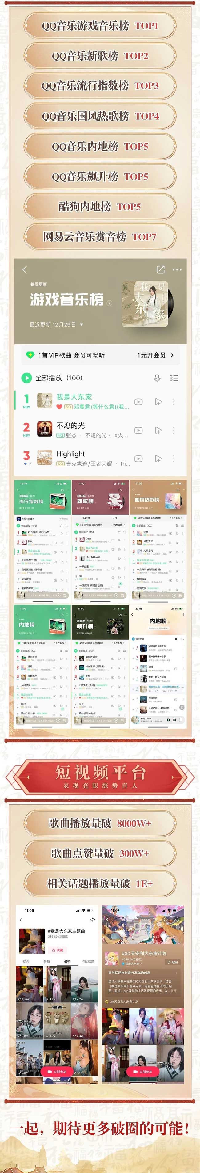 12月22日上线,由超人气国风唱将邓寓君演唱的益世界《我是大东家》游戏同名主题曲已占据各大音乐平台排行榜前列,相关话题视频短视频平台播放量破亿!