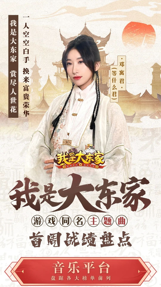 益世界聚焦国风音乐领域,根据《我是大东家》“新国风”的基调,选定超人气国风唱将邓寓君(等什么君)演绎首支同名主题曲,唱出从白手起家到富甲天下的心路历程,引发广大玩家群体的情感共鸣。