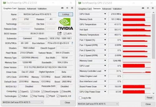由检测软件GPU-Z可看到升 耕升 GeForce RTX™ 4070 Ti 星极幻姬OC的产品规格和基本参数,以及其待机温度为41°C,功耗为18.8W。