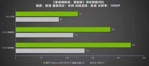 《漫威蜘蛛侠:重制版》是22年最火热的游戏之一,该作为PC端增添了许多特性。在极高画质光线追踪最高的设置下,耕升 GeForce RTX™ 4070 Ti 星极幻姬OC在2K分辨率下可以运行到67帧,1080P下有84帧。在开启DLSS 3 模式后,帧数提升十分明显:2K分辨率下有198帧,1080P也有224帧,游戏过程功率为206W。而RTX 3090 Ti 2K分辨率下仅有116帧,1080P下有134帧。大幅的性能提升得益于DLSS 3 帧生成技术,可以让RTX 40系列玩家获得更极致流畅的游戏体验。