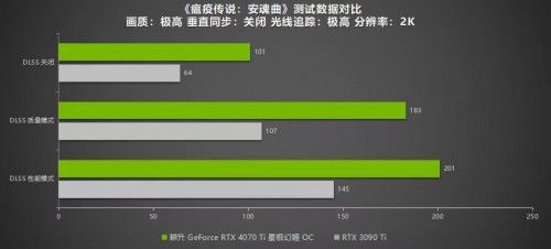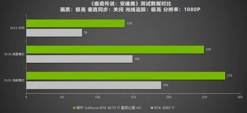 《瘟疫传说:安魂曲》是一款基于中世纪背景的剧情冒险游戏,游戏首发支持NVIDIA DLSS 3和光线追踪技术。在极高画质光线追踪最高的设置下,耕升 GeForce RTX™ 4070 Ti 星极幻姬OC在2K分辨率下可以运行到101帧,1080P下有138帧。但是当开启DLSS 3模式后,帧数有了巨大飞跃:2K分辨率下有201帧,1080P也有279帧,游戏过程功率为219W。而RTX 3090 Ti 2K分辨率下仅有145帧,1080P下有189帧。该帧数可以支持玩家流畅运行该游戏,过程中无任何卡顿现象出现。