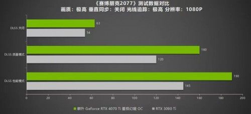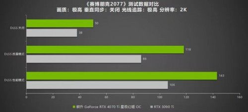 《赛博朋克2077》是当今光追效果最出色的游戏之一,也是首批支持NVIDIA DLSS 3的游戏。在极高画质光线追踪最高的设置下,耕升 GeForce RTX™ 4070 Ti 星极幻姬OC在2K分辨率仅有50帧,1080P下也仅有63帧。但是当开启DLSS 3模式后,帧数就有了极大提升:2K分辨率下有143帧,1080P也有190帧,游戏过程功率为209W。而RTX 3090 Ti 2K分辨率下仅有106帧,1080P下仅有145帧.可以说DLSS 3对游戏的性能提升远高于DLSS 2。