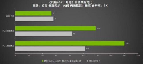 《战锤40K:暗潮》是于2022年11月发布的一款四人合作游戏,NVIDIA DLSS 3可以让玩家们在游戏中畅快杀敌,惩奸除恶。在极高画质光线追踪最高的设置下,耕升 GeForce RTX™ 4070 Ti 星极幻姬OC在2K分辨率仅有53帧,1080P下有77帧。但是当开启DLSS 3模式后,帧数的提升十分明显:2K分辨率下有160帧,1080P也有178帧,游戏过程功率为202W。而RTX 3090 Ti 2K分辨率下仅有102帧,1080P下有121帧。