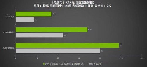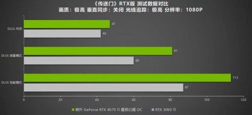 《传送门》RTX版可以说是22年最惊喜的游戏之一,该作利用了RTX Remix将经典游戏重新结构,焕发出不一样的游戏活力。同时,该作配置需求也是十分高要求:在极高画质光线追踪最高的设置下,耕升 GeForce RTX™ 4070 Ti 星极幻姬OC在2K分辨率下可以运行到34帧,1080P下有47帧。在开启DLSS 3 模式后,帧数提升十分明显:2K分辨率下有98帧,1080P也有113帧,游戏过程功率为225W。而RTX 3090 Ti 2K分辨率下仅有80帧,1080P下有87帧。由于该作极高画质下消耗资源巨大,所以只有当DLSS 3 模式开启时才能获得良好的游戏体验。