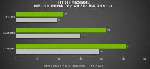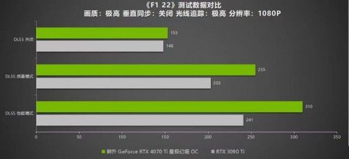 《F1 22》是首批支持NVIDIA DLSS 3中为数不多的赛车游戏,玩家可以在游戏中驾驶F1赛车在世界各地赛道上驰骋。游戏同样支持DLSS 3 和光线追踪技术,在极高画质光线追踪最高的设置下,耕升 GeForce RTX™ 4070 Ti 星极幻姬OC在2K分辨率仅有54帧,1080P下有153帧。但是当开启DLSS 3模式后,帧数的提升十分明显:2K分辨率下有145帧,1080P也有310帧,游戏过程功率为210W。而RTX 3090 Ti 2K分辨率下仅有47帧,1080P下有148帧。可以说这款游戏的优化还是很不错的,在开启DLSS 3 性能模式下最高可以达到300帧以上,给玩家带来极致流畅游戏体验。
