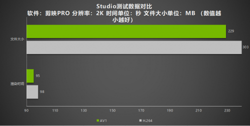 在Studio测试中,分别在剪映PRO使用AV1编码技术和H.264编码技术导出素材,对比两者导出时间的快慢。从结果可以看出,使用AV1编码的导出速度更胜一筹。而且使用AV1编码导出的文件大小也较H.264小。2K分辨率下H.264文件大小为303m,AV1文件大小为229m。1080P下H.264体积为196m,AV1文件大小为150m。对于长期有着视频制作的用户来说推荐使用AV1编码导出视频文件。