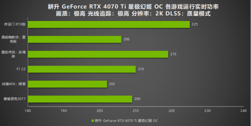 在功耗测试中,可以看到大部分游戏实时运行功率都在200-230W这个区间。个别游戏功率较高,但都在可控范围之内。耕升 GeForce RTX™ 4070 Ti 星极幻姬OC优秀的散热部件和背板可以让玩家们在游戏时显卡温度也能得到很好的控制,让显卡发挥出稳定的性能和延长显卡寿命。
