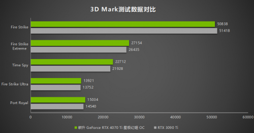 从测试结果上来看,耕升 GeForce RTX™ 4070 Ti 星极幻姬OC和RTX 3090 Ti在3D Mark数据上相差无几,但是在部分测试项目中耕升 GeForce RTX™ 4070 Ti 星极幻姬OC还是略胜一筹。在NVIDIA DLSS Feature 测试中,拥有DLSS 3 的RTX 4070 Ti 比 RTX 3090 Ti高16%的性能。可以看出DLSS 3对游戏性能的提升是十分强大的。