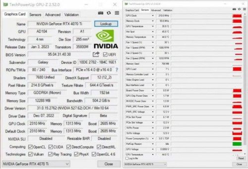 首先还是查看检测软件GPU-Z中,影驰 GeForce RTX 4070 Ti 星曜 OC 的产品规格和基本参数,通过数据可以得知其待机温度为35.9°C,功耗为8.5W。