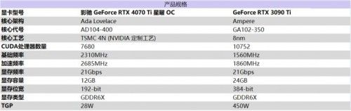 首先来看一下影驰 GeForce RTX 4070 Ti 星曜 OC 与GeForce RTX 3090 Ti 规格参数对比: