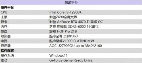 测试环节的平台处理器用到了Intel Core i9-12900k,主板选择了影驰Z690金属大师主板,内存使用的是芝奇幻锋戟 DDR5 6000Hz 16GB*2;固态上采用了影驰 Hof Pro 2TB。PCIe4.0 固态的超高读写速度搭配超高性能的配置让影驰 GeForce RTX 4070 Ti 星曜 OC的超高性能在测试中得到持续稳定的发挥。