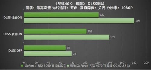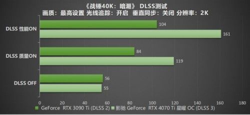 对于2K分辨率而言,玩家想要使用影驰 GeForce RTX 4070 Ti 星曜 OC 畅玩《战锤40K:暗潮》,其帧数能稳定在55帧,仅仅是正常水平。但是通过NVIDIA DLSS 技术的加持,在DLSS 3两个模式下,分别提升到了119帧和161帧。最高达到140%的数据提升足以见证DLSS 3技术强悍的性能。DLSS 2的加持最高也能够让RTX 3090 Ti的帧数达到104帧。