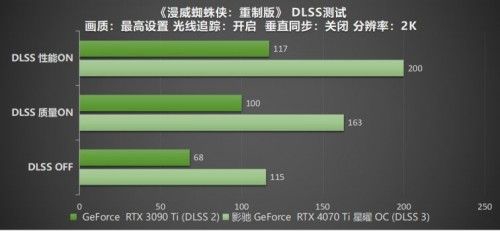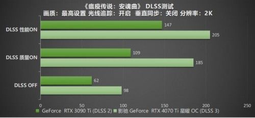 影驰 GeForce RTX 4070 Ti 星曜 OC的性能配置让其在2K 分辨率下已能够畅玩,而DLSS 3技术的加持更是让其帧数上升到100帧和117帧。RTX 3090 Ti 也可以畅玩该款游戏,帧数跑到了68帧。开启DLSS 模式后的游戏帧数更是上涨到了100帧和117帧。可以看得出DLSS 技术到底是有多强悍了。