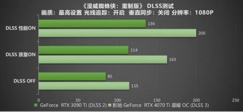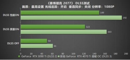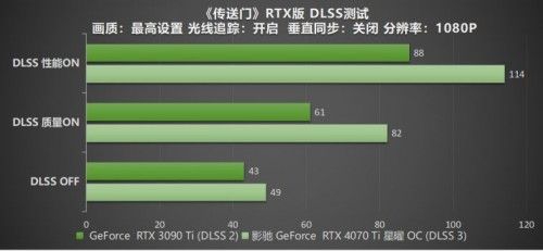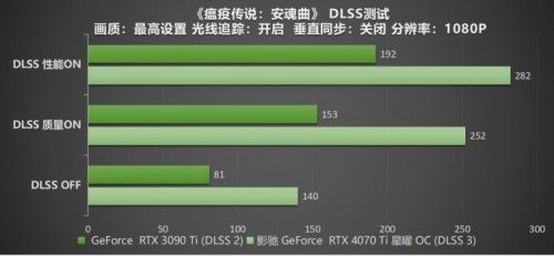 1080p下,影驰 GeForce RTX 4070 Ti 星曜 OC 也是只能达到49帧。开启DLSS 3模式后则是分别上涨了67.3%和132.6%,即82帧和114帧。而RTX 3090 Ti如果是开启DLSS 性能模式也能够达到90帧,是能够运行该游戏的。