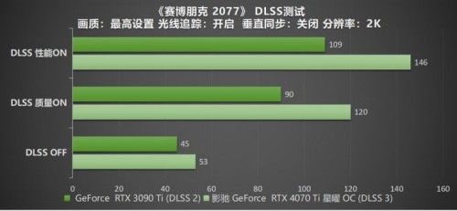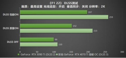 在关闭NVIDIA DLSS 功能的时候,影驰 GeForce RTX 4070 Ti 星曜 OC 的性能配置能让帧率在2k分辨率下保持在98帧。而开启NVIDIA DLSS 3模式后,帧数上涨了96%。在性能模式下更是上涨到了205帧。而 RTX 3090 Ti 在开启DLSS 2性能模式时的帧数也高达147帧。