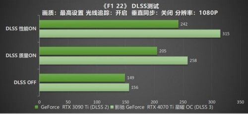 影驰 GeForce RTX 4070 Ti 星曜 OC在1080p下的成绩就更为优异了,即便是没有DLSS 3的加持也可以跑到156帧。而开启后则是分别可以达到258帧和315帧的高分。这款游戏RTX 3090 Ti 也可以拥有良好的游戏体验,帧数可以达到149帧。开启DLSS 2 模式后可以分别跑到205帧和242帧。