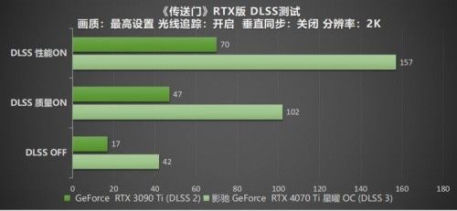 2K模式下的影驰 GeForce RTX 4070 Ti 星曜 OC 仅仅拥有42帧,可见这个游戏的制作是有多盛大。而通过DLSS 3技术的加持,帧数拥有质的飞跃。质量模式下上涨到了102帧,而性能模式下的帧数更是上涨了273.8%。反观,RTX 3090 Ti 即便拥有DLSS 2的加持,游戏《传送门》也仅仅是跑到了70帧,勉勉强强达到了及格以上的标准。