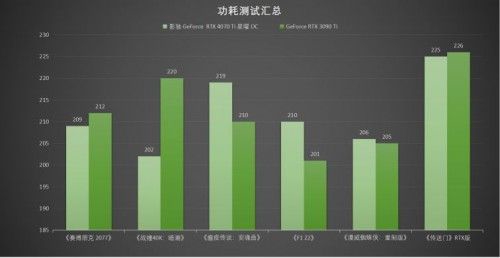 数据还对比了影驰 GeForce RTX 4070 Ti 星曜 OC和 GeForce RTX 3090 Ti 在2K分辨率下的实际游戏运行功耗。可以看到,影驰 GeForce RTX 4070 Ti 星曜 OC 在进行这六款游戏时,整体平均功耗为212W。