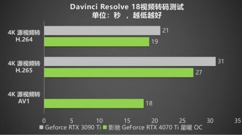 最后在Davinci Resolve 18 视频转码测试中,分别使用AV1编码技术、H.265编码技术和H.264编码技术导出素材,对比两者间所使用的时长。可以看出,在4K分辨率下,影驰 GeForce RTX 4070 Ti 星曜 OC 新增了AV1编码技术,整体比GeForce RTX 3090 Ti均是更胜一筹的。