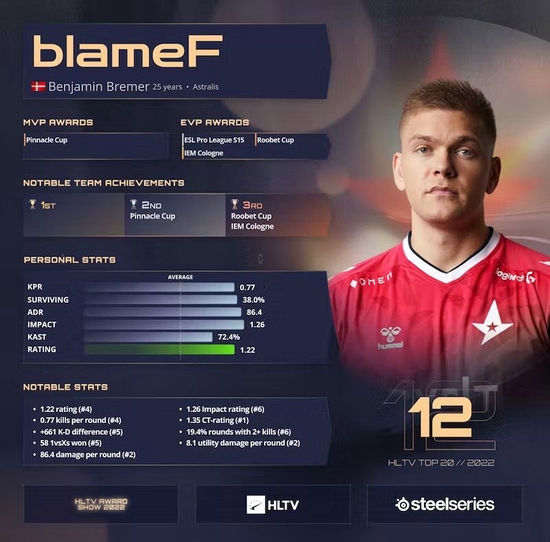 2022年,尽管Astralis经历了一系列的阵容和教练调整,以及一连串的糟糕成绩和表现,blameF相比去年名次提升1位,排名本年度选手第12位。即便是动荡的一年也没有影响blameF的出色发挥,并且在调整了进攻方的角色后,blameF仍旧交出了所有17项赛事16项正战绩的优秀答卷,表现令人印象深刻。